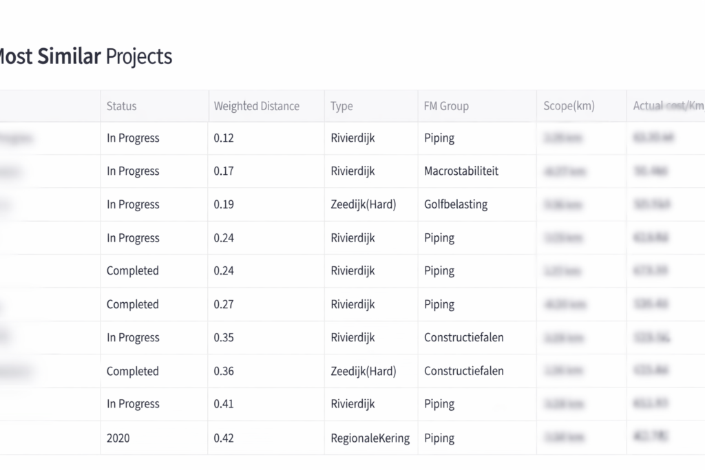 Het systeem identificeert automatisch vergelijkbare historische projecten op basis van multidimensionale overeenkomst in onder meer: