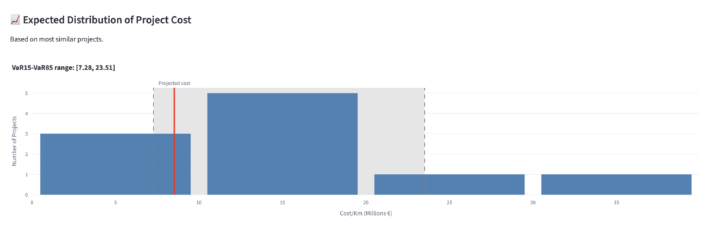 Voor afgeronde projecten kunnen gebruikers de door het model voorspelde kosten vergelijken met de werkelijke (voor inflatie gecorrigeerde) kosten – dit biedt een directe validatie van de prestaties van het model en creëert vertrouwen in de uitkomsten.