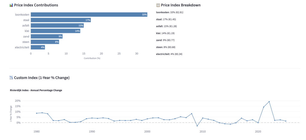 For this case we apply the RCF-AI tool specifically to dyke reinforcement projects. It combines predictive modelling, explainability, inflation risk analysis and benchmarking against similar projects—all within a single, intuitive dashboard.